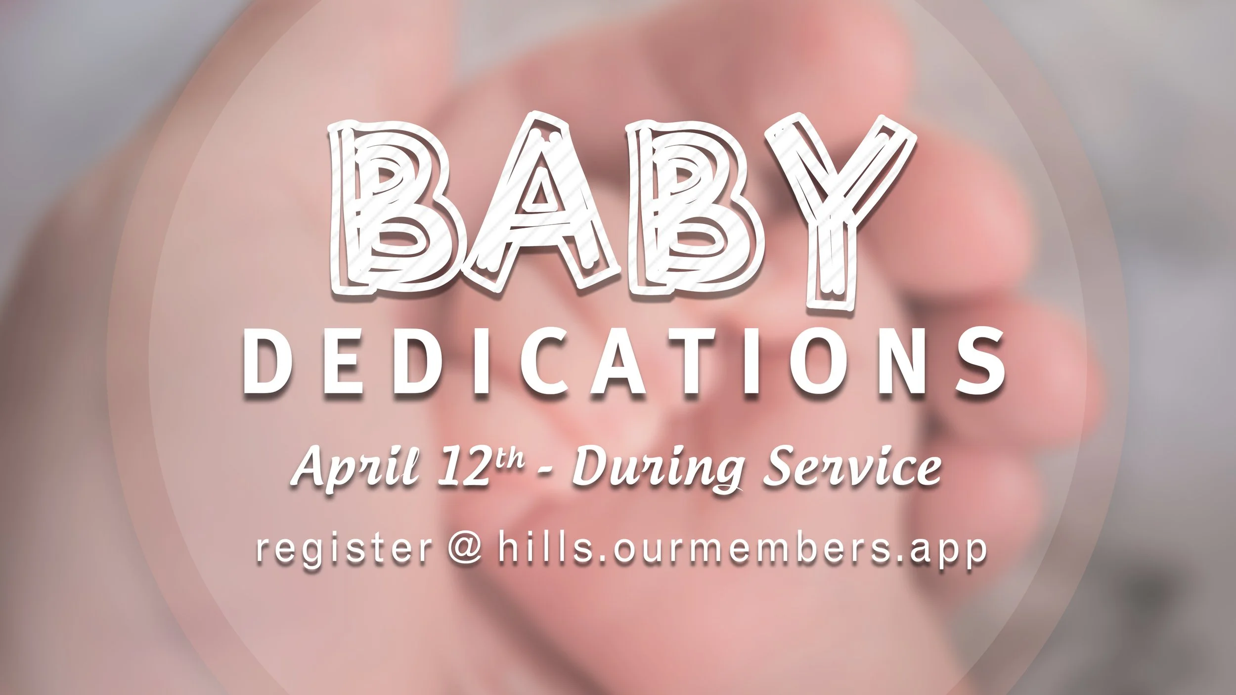 We will be dedicating babies & young children to Jesus during our service on April 12th. If you would like to dedicate your child at either service that Sunday, please register for this event @ hills.ourmembers.app and our Kids' Program Director will reach out to you.